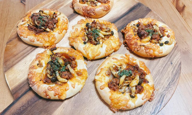 ピザ&パスタソースを使ったデミ風味のミートとキノコをたっぷりのせたお惣菜パンです。