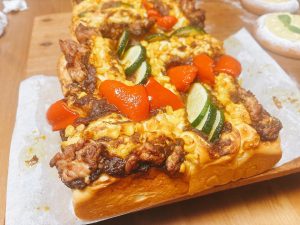 手作りのカレーソースにお肉、パプリカ、ズッキーニを入れたちぎりパン風です。